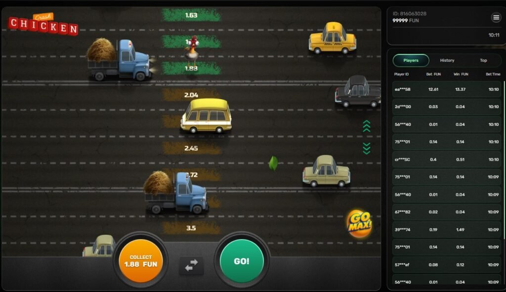 La troisième étape lance la partie proprement dite. Cliquez sur « Play » puis sur « GO » pour que le poulet s’engage sur la route. Le multiplicateur s’affiche en temps réel, augmentant à chaque ligne franchie. Les véhicules circulent de manière aléatoire, contrôlés par l’algorithme RNG du jeu.